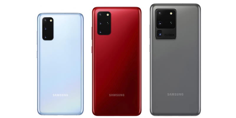 - Galaxy S20 – три модуля: ультраширококутний 12 Мп, F2.2 (120˚) / ширококутний 12 Мп, F1.8 (79˚) / телефото 64 Мп, F2.0 (76˚). Підтримується 30-кратний зум.