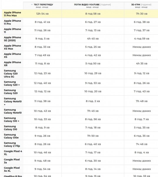 У тесті серфінгу по мережі лідером став iPhone 11 Pro Max – він протримався 12 годин 54 хвилини. Друге місце зайняв Samsung Galaxy S20 + з результатом 12 годин 40 хвилин. Бронза у Samsung Galaxy S20 Ultra 5G – 12 годин 23 хвилини. У п’ятірці лідерів також OnePlus 8 (12 годин 15 хвилин) і Samsung Galaxy S20 (12 годин 12 хвилин).