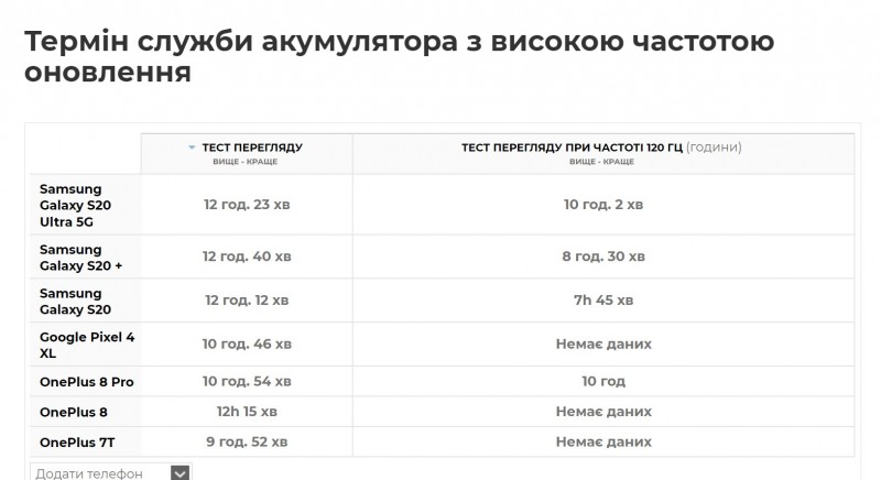При роботі в мережі з високою частотою оновлення екрану – 120 Гц – кращий результат у Samsung Galaxy S20 Ultra 5G. Він працював 10 годин 2 хвилини. Друге місце зайняв OnePlus 8 Pro – 10 годин рівно. Замикає трійку лідерів Samsung Galaxy S20 + з 8 годинами і 30 хвилинами.