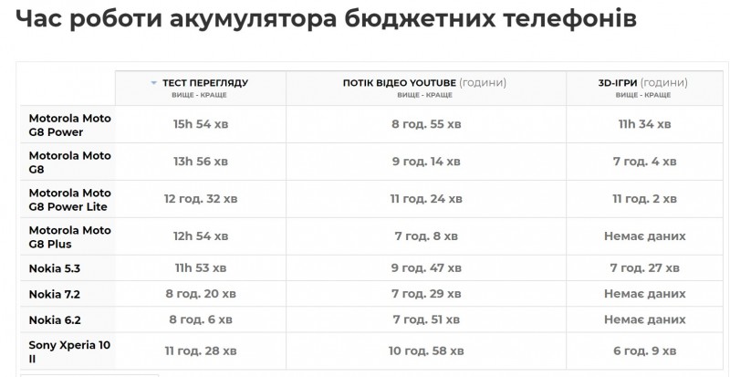 Автономним лідером серед бюджетних смартфонів став Motorola Moto G8 Power – при серфінгу в мережі він протримався 15 годин 54 хвилини. Друге місце у Motorola Moto G8 – 13 годин 56 хвилин. А третє місце зайняв Motorola Moto G8 Plus – 12 годин 54 хвилини.